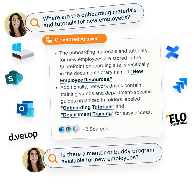 Während andere KI-Plattformen erst seit 2023 mit uploadbasierten Chatbots angefangen haben, haben wir von Anfang an auf nahtlose Integration gesetzt. Unsere Lösung respektiert bestehende Zugriffsrechte und verwandelt dein Unternehmenswissen in präzise, individuelle Antworten.